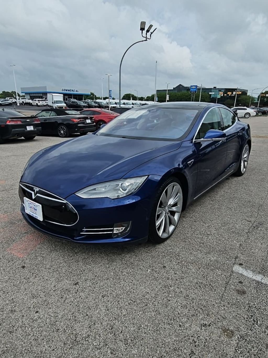 Discover the exhilarating performance and cutting-edge technology of this 2015 Tesla Model S P90D. This stunning electric vehicle boasts a deep blue metallic exterior, complemented by a luxurious tan leather interior, creating a striking and sophisticated presence on the road.